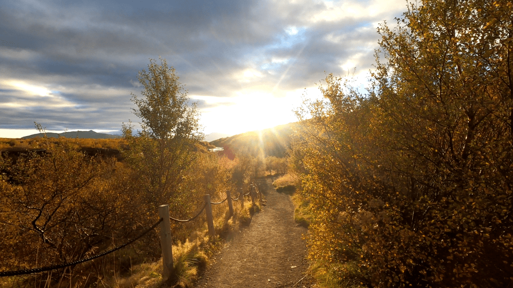 Wir haben vor Ort noch etwas Zeit verbracht und uns den nahegelegenden Barnafoss angeschaut. Der Weg dorthin war ebenfalls sehr schön. Auch hier war es so, als würde Mutter Natur es für eine gute Idee halten, alles in warme Goldtöne zu tauchen. Wäre ich nicht dabei gewesen, ich hätte die Beschreibung der Szenerie für kitschig empfunden. Aber es war nun mal wirklich zauberhaft.