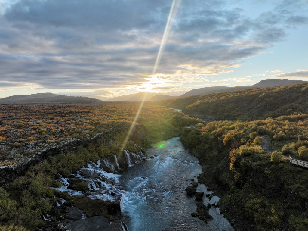Unser erstes Ziel war der Hraunfossar. Die Sonne hatte gerade ihren Weg über die Berge geschafft und wollte nun noch höher hinaus. Für uns natürlich sehr schön. Zumal der Hraunfossar mühelos als Ereignis durchgeht und wir hier ziemlich alleine waren. Selbstredend packe ich bei so einer Gelegenheit auch schnell mal meine Drohne aus.