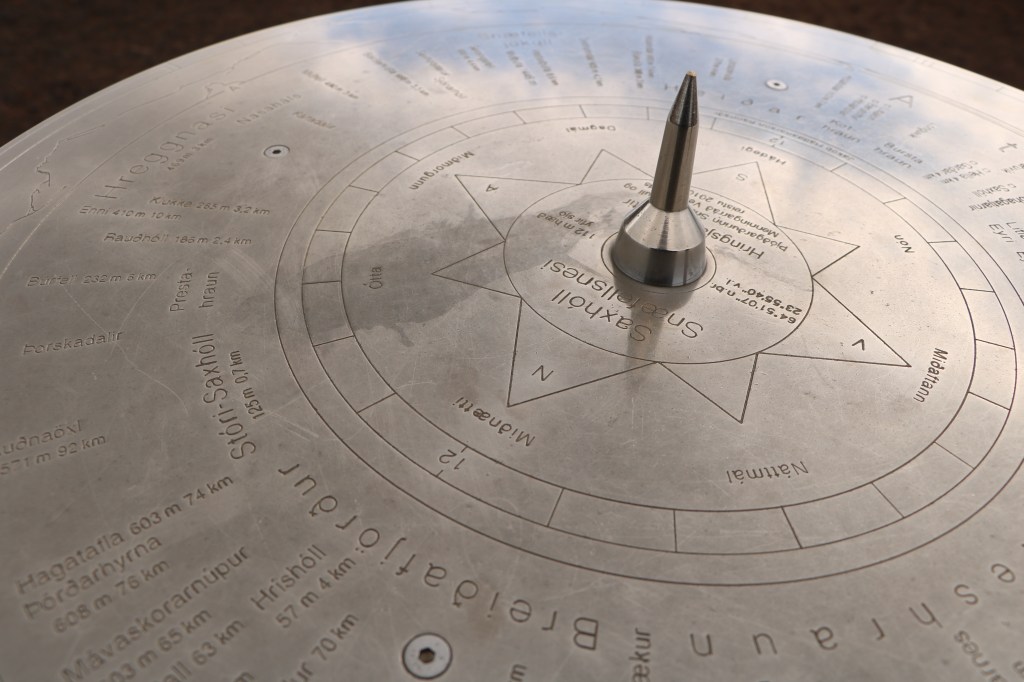 Ich bin auch nicht sicher, wie dankbar meine liebe Frau darüber so ist. Manchmal möchte sie nämlich hoch-anspruchsvolle Bilder machen. So geschehen beim Saxhóll Crater, auf dessen Weg man eine Scheibe finden kann, die alles Sehenswerte in der Umgebung zeigt. Das Wunschfoto sollte in diese Richtung gehen: