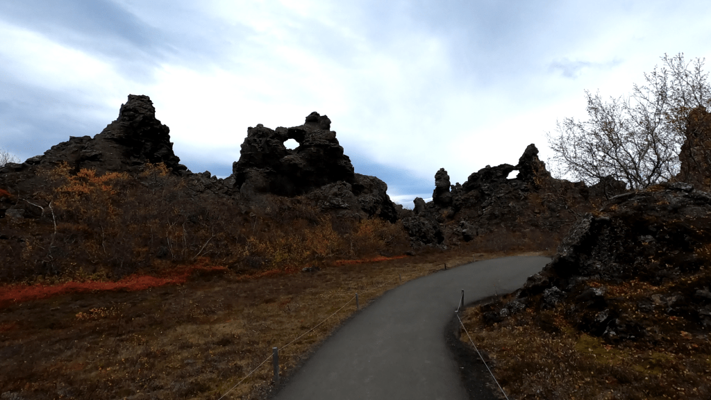 Doch egal wie faszinierend die Gebilde im Himmel so sind, wir sind für die Highlights auf dem Boden hier. Namentlich besagtes Dimmuborgir. Übersetzt bedeutet der Name soviel wie „Dunkle Türme“. Vermutlich hängt es davon ab, wie man an die Sache rangeht. Für die Einen ist es ein erstarrtes Lavafeld. Man kann gut sehen, wo einst brodelndes Gestein bizarre Formen schaffte und sich teilweise mehrere Meter über den Boden aufbaute. Für die Anderen ist es die Heimat von Trollen und Elfen. Für sie gibt es eine Kirche, einen Markt und diverse Behausungen zu sehen.