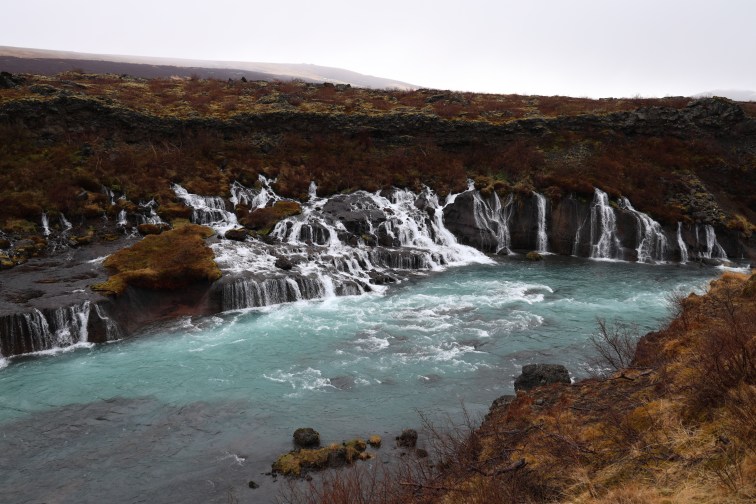 Da es immer noch regnete und der Tag noch recht jung war, standen wir allein an diesem Phänomen. Und weil so Phänomene in Island eher selten Einzelkinder sind, befindet sich ein paar Meter neben dem Hraunfossar der Barnafoss.