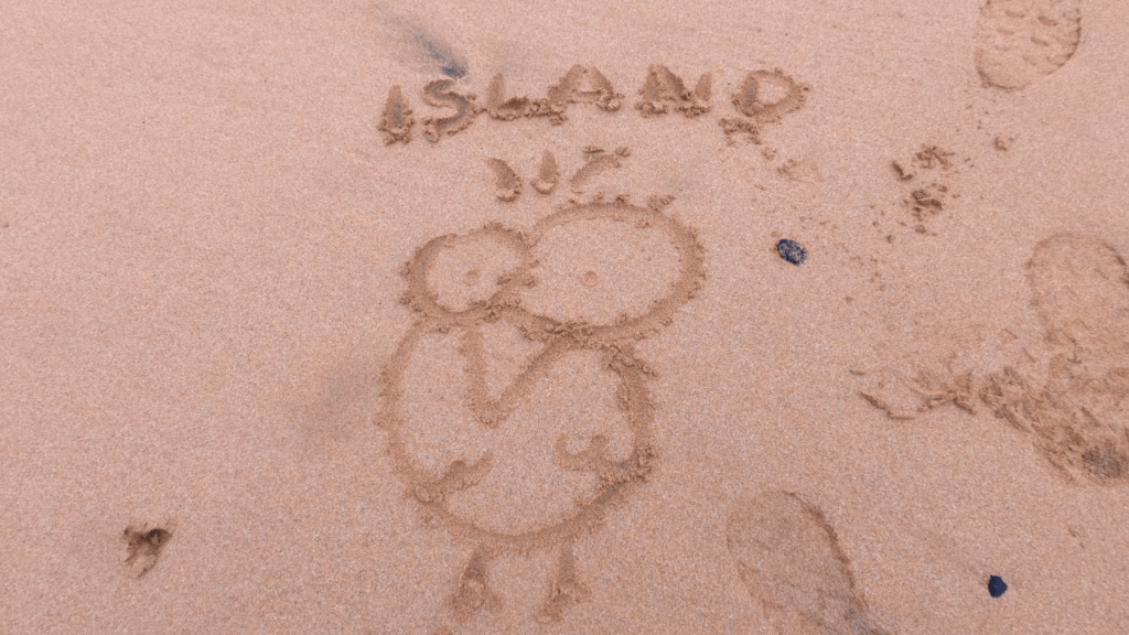 Außerdem, gibt es durch die Unmengen an unverbrauchtem Sand genug Gelegenheiten, um Dinge im Sand zu zeichnen. Manche Chancen nutze ich sogar.