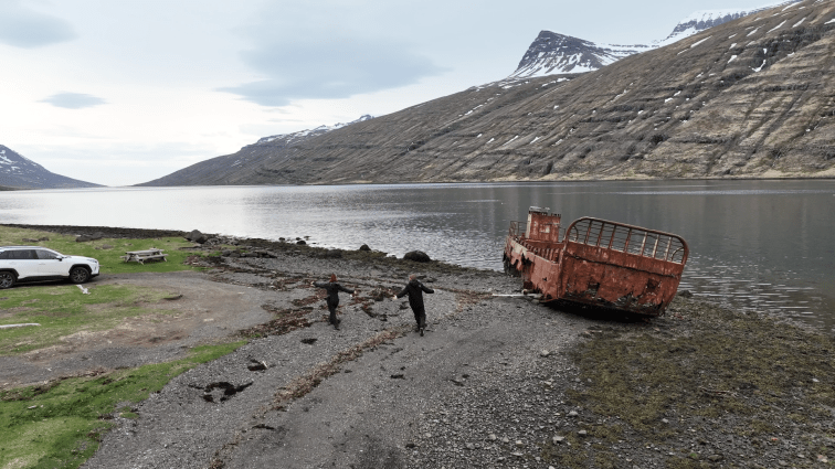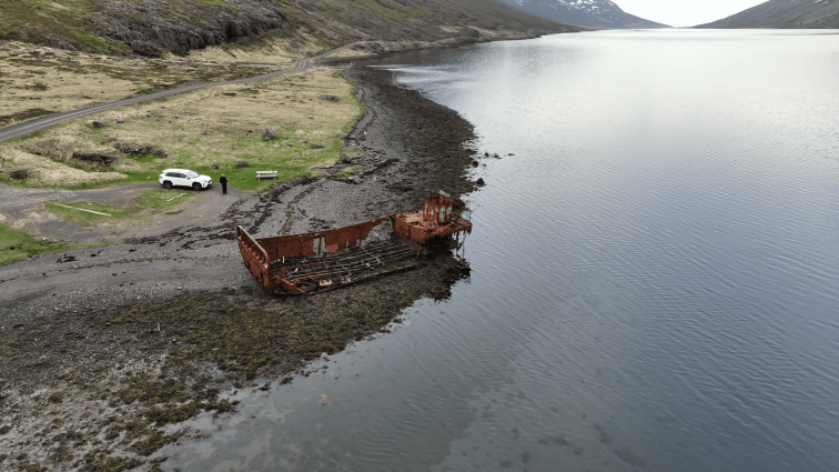Wir haben dieses Ziel übrigens gewählt, weil es hier ein altes Wrack eines U.S. Bootes geben sollte. In der Tat fanden wir ein Wrack aber… das war schon sehr zerfallen und traf nun nicht gerade meinen Sinn für Ästhetik. Aber Dank der hohen Berge um uns, war es dort relativ windstill. Mehr Einladung brauche ich für die Drohne nicht.