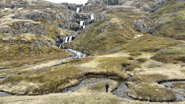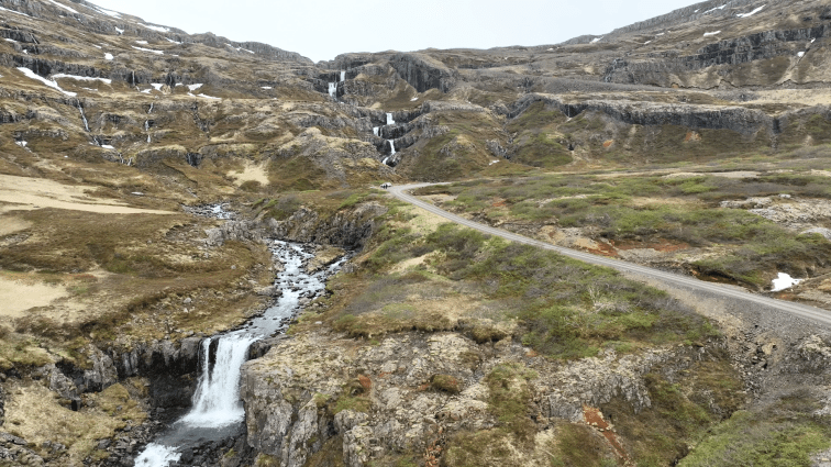 Ungeachtet des Störgefühls der Gänse blieben wir noch eine Weile am Kliffbrekkufossar stehen. Es handelt sich hierbei um einen sehr beeindruckenden Wasserfall der sich malerisch durch die Landschaft schlängelt. Die Aufgabenverteilung sah hier so aus, dass meine Gattin zu Fuß die Umgebung unsicher machte und ich mit der Drohne den Luftraum kontrollierte.