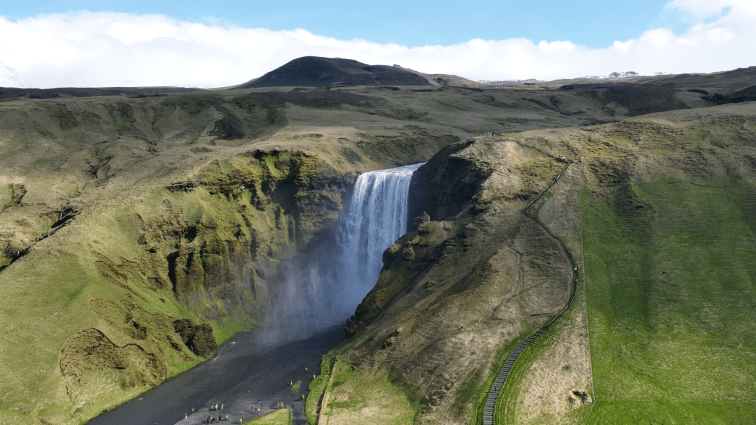 Vielleicht ist die Einfachheit. Es ist ein Wasserfall, der ohne Kaskaden schön gleichmäßig fällt. Links und rechts sind halbwegs gleichhohe Wände mit Gräsern und Moos und im Hintergrund kommt je nach Licht eine schneebedeckte Bergwelt oder eine wabernde Wolkendecke. Man kann hier auch nicht falsch stehen – der Skógafoss sieht aus jeder Perspektive gut aus.
