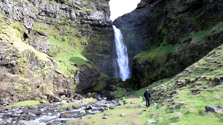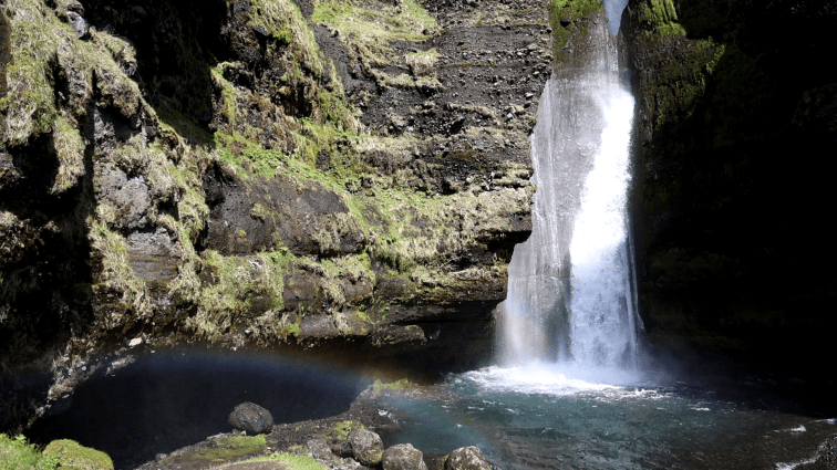 Glugga heißt soviel wie Fenster. Vor Ort sieht man recht gut, dass das Wasser weiter oben durch eben so eine Art Fenster fällt. Das ganze passiert in einer Felsspalte und wenn die Sonne dann noch hineinfällt, hat dieser Ort etwas magisches.