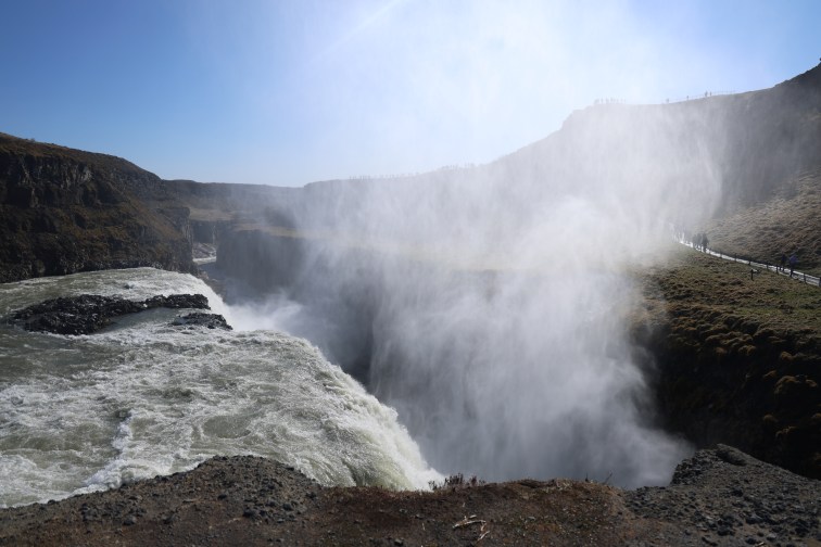 Als erstes waren wir beim Namensgeber des Golden Circle – dem Gullfoss. Gull heißt einfach Gold und Foss bedeutet Wasserfall. Neben diesem bescheidenem Namen ist der Gullfoss wirklich sehr beeindruckend. Es geht schon damit los, dass man vom Parkplatz diese riesige Gischtwolke sieht, die von einem Regenbogen durchzogen wird.
