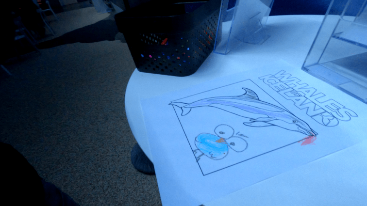 Ein Highlight gab es dann allerdings doch noch. Kurz vorm Ausgang gab es die Möglichkeit, das man einen Wal ausmalt. Ich präsentiere nicht ohne Stolz: Murphy vor einem Wal