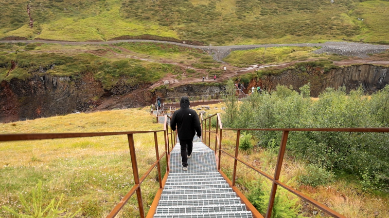 Als erstes fand der Canyon mit dem wunderschönen Namen Stuðlagil den Weg in unser Navi. Auf dem Weg dorthin stellte ich fest, dass ich wahlweise ein zu guter Autofahrer bin oder mittlerweile einfach viel zu gewöhnt an Schotterpisten. Der Weg zum Stuðlagil ist sicherlich nicht optimal aber kann problemlos gefahren werden. Vor uns bewegten sich jedoch auf einmal mehrere Autos im Schneckentempo. Wenn ich an ihre Geschwindigkeit denke, könnte man die These aufstellen, dass sie die 10km zum Canyon noch immer nicht geschafft haben. Aber sei es drum – Kraft meiner Wassersuppe und dem Gaspedal konnten alle überholt werden und wir kamen damit relativ gut auf dem Parkplatz an. Als nächstes folgen Treppen – viele Treppen.