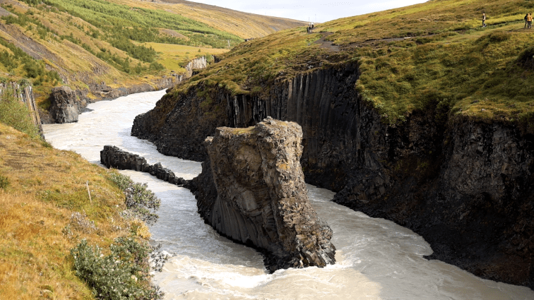Die meisten Touristen wählen aus Gründen auch eher die andere Seite des Stuðlagil. Hier wandert man je nach Verfassung irgendwas um 45-60 Minuten um im Grunde an der gleichen Stelle zu stehen. Theoretisch kann man dann noch elegant für Instagramfotos an den Basaltsäulen stehen. Allerdings versuchen das parallel mindestens 20 andere Leute auch. Mir wäre das ja zu stressig.