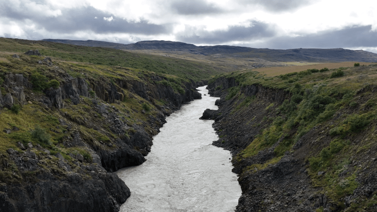 Unser nächster Stopp war wirklich nur ein Stopp. Namentlich Jökulsá á Brú. Es handelt sich um einen kleinen Parkplatz neben einer Brücke. Der Fluss unter der Brücke ist der gleiche, der beim Stuðlagil bereits fotogen durch einen Canyon fließt.