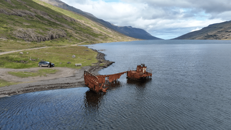 Für uns ging es dann noch ein Stück in den Fjord, zu einem alten Schiffswrack der amerikanischen Navy. In den 60iger kam jemand auf die Idee, dass es clever wäre die schweren Bulldozer nicht um die Fjorde zu fahren sondern mit einem Landungsschiff zu transportieren. Nachdem das Ding binnen eines Jahres mehrfach beinahe gesunken wäre, wurde es beim letzten Retten einfach am Strand geparkt und da liegt es nun.