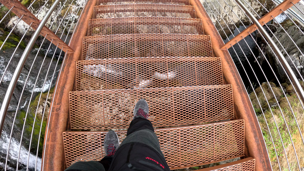 Der Wasserfall-Trail ist augenscheinlich auch mit viele Liebe angelegt worden. Man hat so kleine Adrenalin-Kicks, wie zum Beispiel eine Gittertreppe über einem Wasserfall.