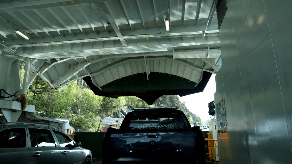 Eher fasziniert als eingeschüchtert zogen wir weiter. Wir wollten mit einer Fähre die nächste Etappe überbrücken und hatten dabei das Glück, dass jene Fähre gerade schon da stand. Ohne Wartezeit ging es also direkt wieder übers Wasser. Das ist nun unsere vierte Fährfahrt in kürzester Zeit gewesen. Die Aufregung der ersten Fahrt ist weit weg. Wie am Ende der Fahrt so ein Schiff aufklappt, bleibt indes faszinierend.