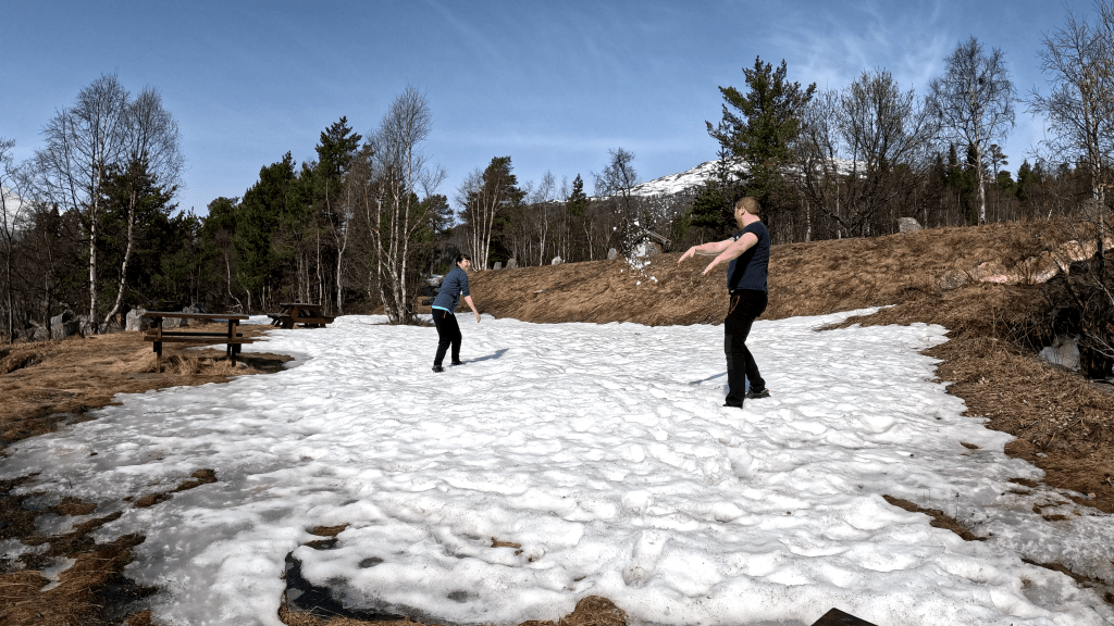 Und was machen erwachsene Menschen, wenn sie im angehenden Sommer Schnee finden? Richtig! Eine Schneeballschlacht!