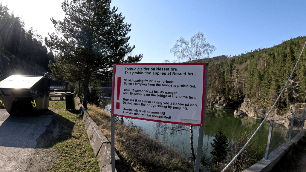 Beim ersten Halt darf man sich berechtigt fragen, ob meine Frau mich noch liebt oder subtil versucht mich loszuwerden. Da war eine Brücke. Vor der Brücke erstmal ein Warnschild.
