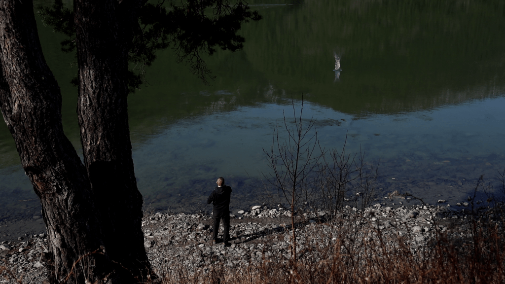 Meine Frau fragte dann nach einer kurzen Inspektion der Umgebung. „Hast du Lust hier ein bisschen zu fliegen?“ Ja, hab ich tatsächlich. Unweit vom Rastplatz und den Bäumen durchzog ein noch teilweise zugeschneiter Fluss die Landschaft. Zu Fuß kommt man da vermutlich gar nicht hin. Mir gefällt der Gedanke, dass ich mit der Drohne etwas „einfangen“ konnte, was man sonst wohl nie zu Gesicht bekommen hätte.