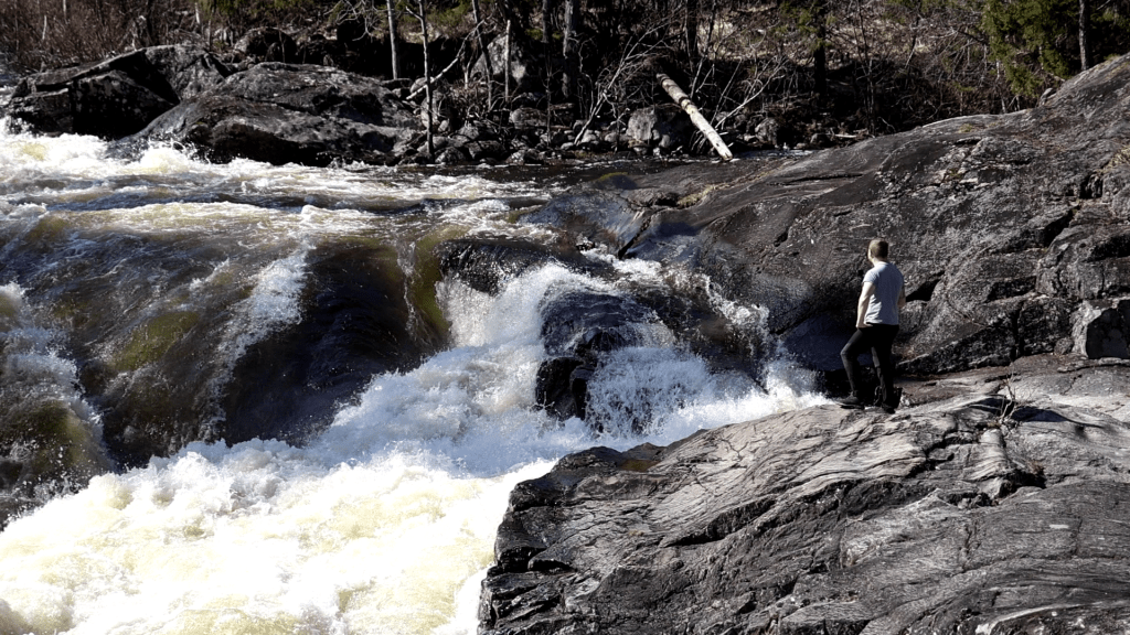 Wie man auf dem Bild vielleicht auch schon gesehen hat, habe ich dazu einen Weg gefunden, sehr nah ans Geschehen zu kommen. Ich stand dabei recht sicher und erhöht auf einem Felsen. Es reichte indes, dass ich wenig Spritzwasser abbekam und den kühlen Luftzug spürte, den der Fluss erzeugte. Ich war sehr angetan und beeindruckt.