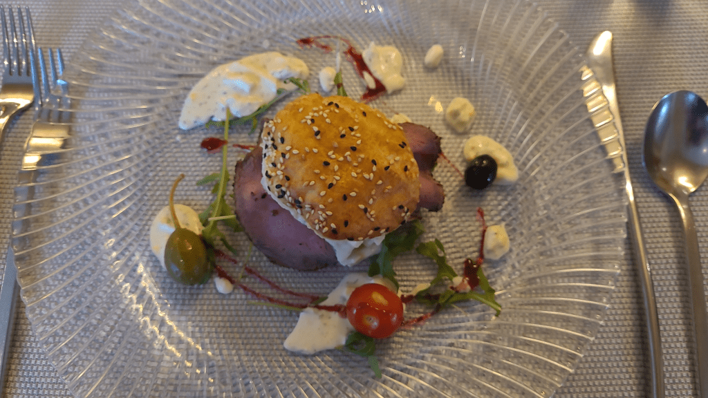Nach nun mehreren Aperol und den vorhergegangenen Radlern war der Zeitpunkt gekommen, eine Besonderheit des hiesigen Hotels auszuprobieren. Namentlich bin ich im „Hotel zum Gourmet“ und man bot mir an, dass ich abends ein 4 Gänge Menü bekommen könnte. Das lass ich mir natürlich nicht entgehen.