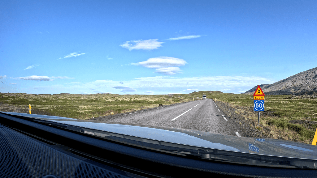 Ein paar Meter später aber dann ein echtes Highlight. Auf der Straße stand ein junger Polarfuchs. Die sieht man ähnlich selten, wie Nordlichter.