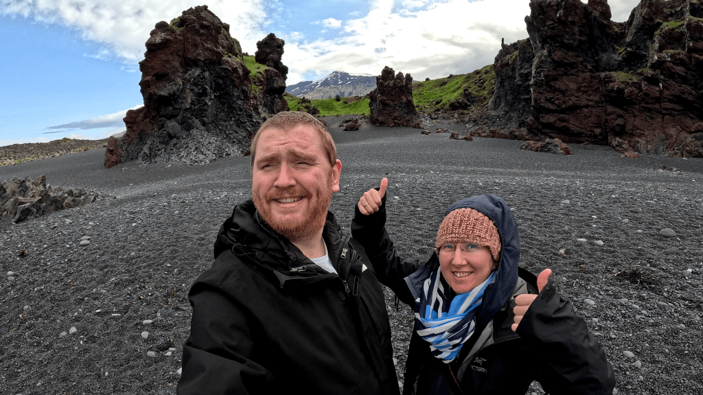 Als nächstes ging es zum Lóndrangar. Das ist eine spannende Felsformation direkt an der Küste. Vom dazugehörigen Parkplatz hatten wir einmal mehr einen tollen Blick auf den Gletscher. Hier nun auch mal ein Foto von Murphy vorm Gletscher.