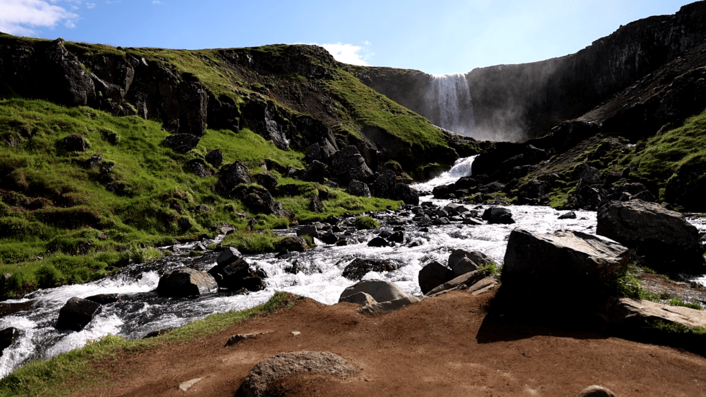 Wenig später standen wir dann beim Bjarnafoss. Ich weiß nicht genau warum, aber ich flog wieder im Zeitlupenmodus. Aber auch hier gilt: Das Motiv ist in jeder Geschwindigkeit toll. Blöderweise hatte neben uns auch ein Rudel Möwen ein morgentliches Stell-dich-ein. Ich landete die Drohne dann lieber und machte mich zu Fuß zum Wasserfall.