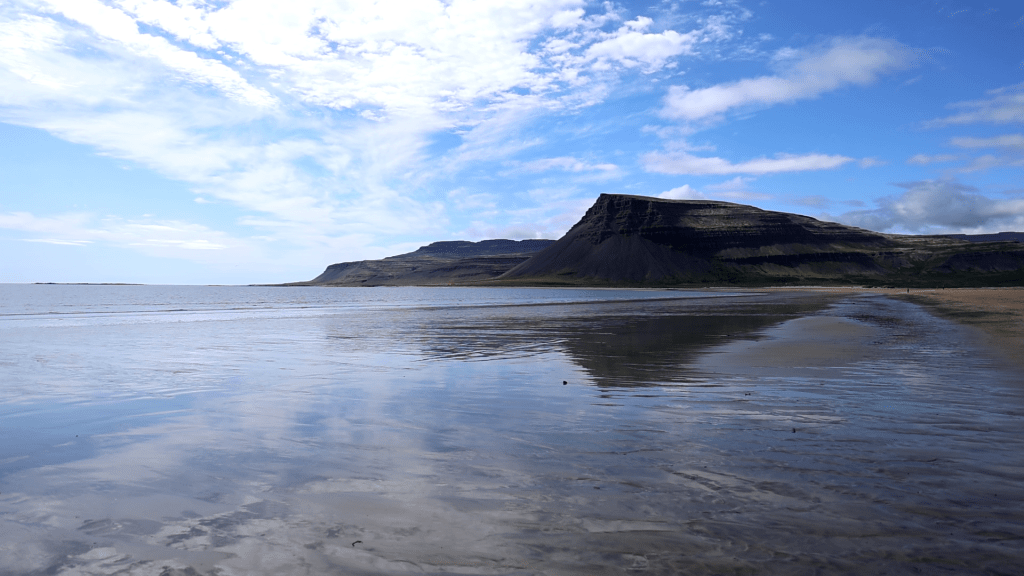 Wir fuhren dann ein Stück und fanden uns am nächsten Strand wieder. Der Barðastrandarsandur ist letztlich auch nur 40 Minuten weit weg gewesen. Auch hier erlaubte die Ebbe, dass man sehr weit zum Wasser gehen konnte. Das gute Wetter machte dazu möglich, dass man bis nach Snæfellsnes schauen konnte.