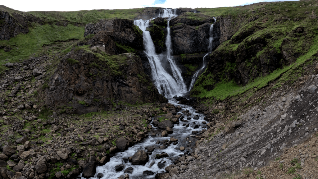 Wir kamen dann irgendwann wieder auf der Ringstraße an. Dort fuhren wir zu einem Wasserfall, den wir von den letzten Reisen noch gut kannten. Der Rjúkandafoss liegt passenderweise direkt neben der Straße und ist ohne große Mühen für ein paar Fotos gut.
