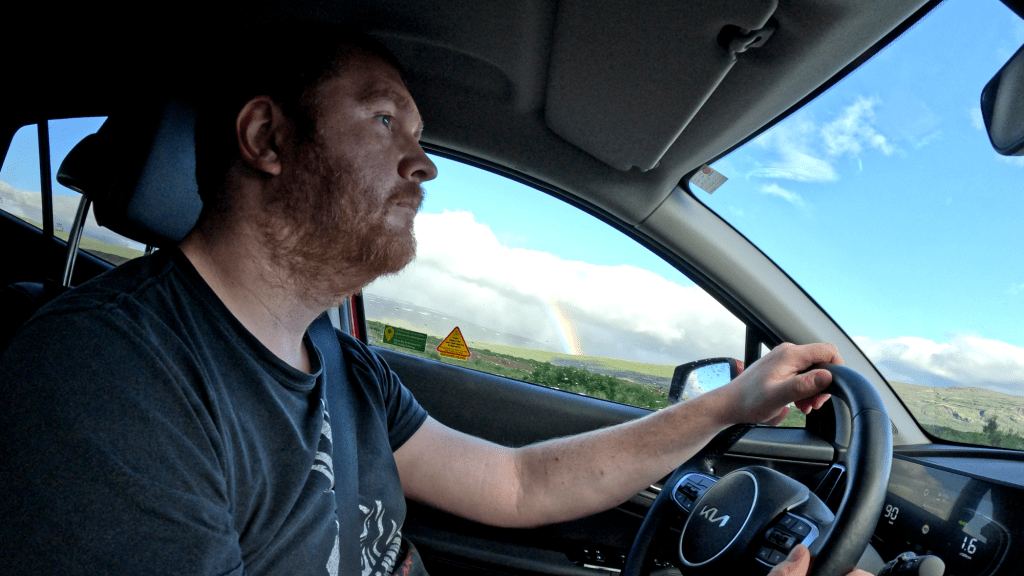 Vielleicht wollte Island mich aufmuntern oder doch ein wenig verhöhnen. Nach diesem kleinen Intermezzo saß ich völlig gerädert hinterm Lenkrad und neben mir ploppte der wohl dickste Regenbogen seit langem auf.