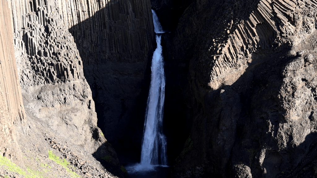 Allein für diesen Wasserfall hätte sich das frühe Aufstehen schon gelohnt. Der Litlanesfoss fällt aus beachtlicher Höhe. Umrahmt wird er von Basaltsäulen und unten fließt er dann durch einen steilen Canyon ins Tal. Das war schon sehr hübsch.