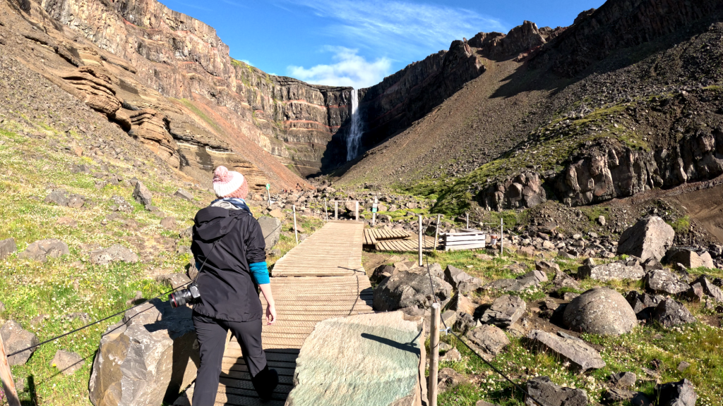 Die Wanderung zum Wasserfall ist anders als das, was wir sonst kennen. Normalerweise laufen wir durch Wälder und Fjorde und am Ende kommt dann aus dem Nichts die große Überraschung in Form eines Wasserfalls. Beim Hengifoss geht man relativ unspektakulär einen Berg hoch und sieht dabei die ganze Zeit besagten Hengifoss oben auf einen warten.