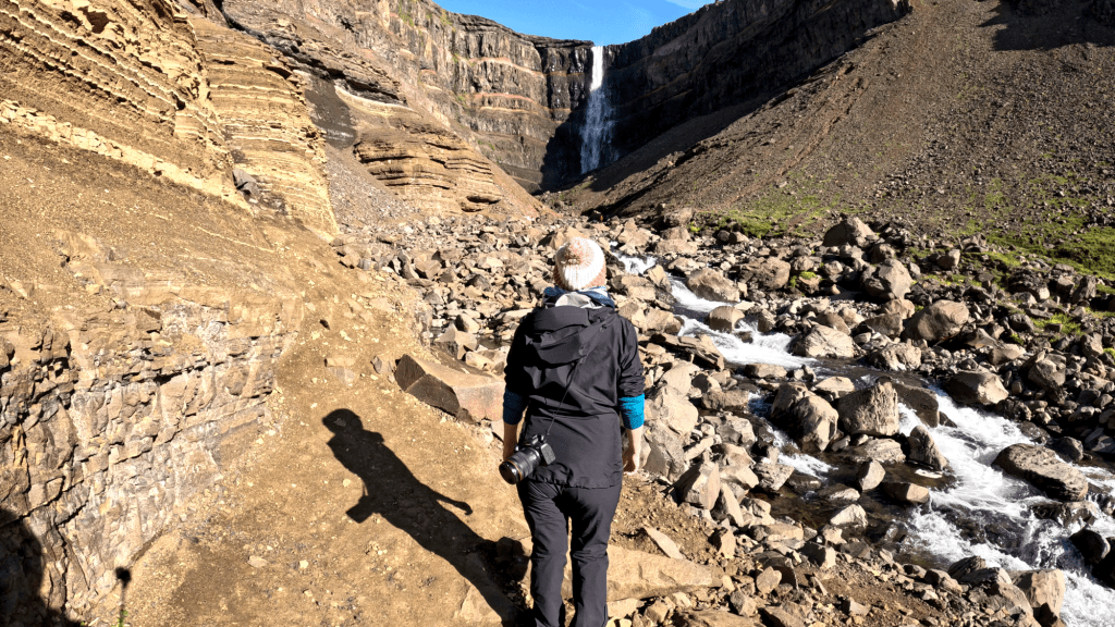 Theoretisch kann man wohl bis fast ganz an den Wasserfall. Das erschien uns aber irgendwie nicht lohnend. Denn wir saßen echt schön beim Wasser, schauten auf den imposanten Hengifoss und seine gut sichtbaren Sedimentschichten. Das Farbenspiel an den Wänden ist dabei fast genauso beeindruckend, wie der Wasserfall selbst.