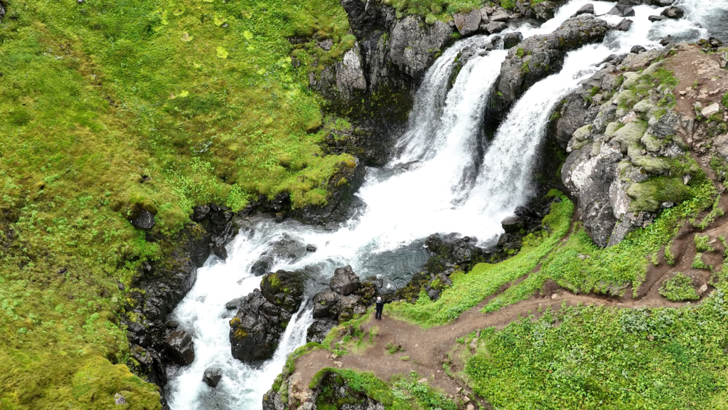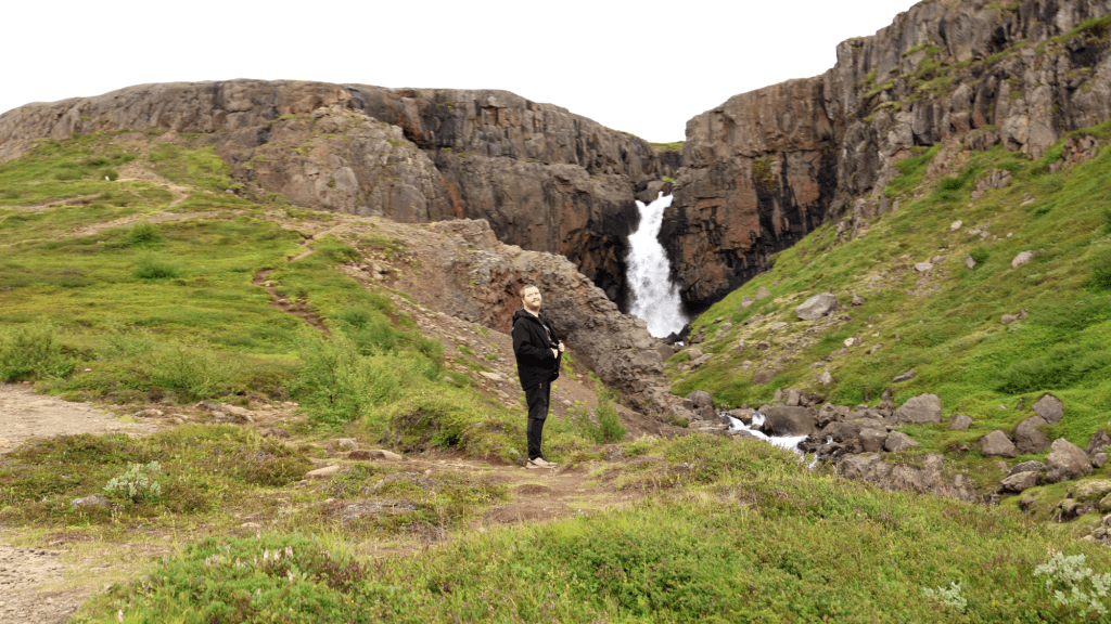 Genau genommen fließt hier überall Wasser. Es kommt von den Hängen, es fließt durch Bäche und selbst die Wiesen stehen unter Wasser, wie ich heute dann mit nassen Füßen feststellen musste. Der Klifbrekkufossar ist nichtsdestotrotz ein sehr beeindruckender Wasserfall. Auch deshalb, weil man von seinem Fuße einen weiteren tollen Blick ins Tal und die dahinter liegenden schneebedeckten Berge erhaschen kann.