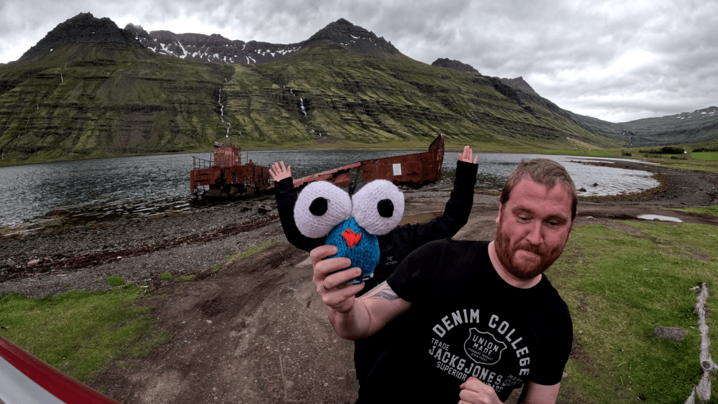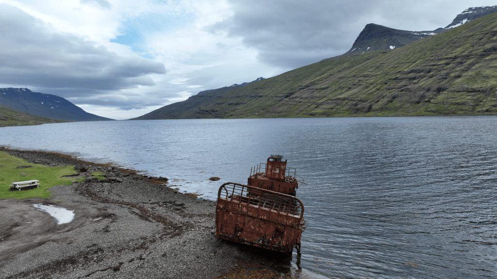 Folgt man der einzigen Schotterpiste weiter in den Fjord, kommt man zu einem kleinen Rastplatz, wo die US Navy vor Jahren mal ein Schiff zur ewigen Ruh‘ gebettet hat. Wir nutzten den Ort dann ganz profan um nun endlich doch mal was zu essen. Ein paar Wraps mit Wurst und Käse taten echt gut und gaben neue Kraft. Diese neue Kraft wurde auch direkt in Dummheiten umgewandelt.