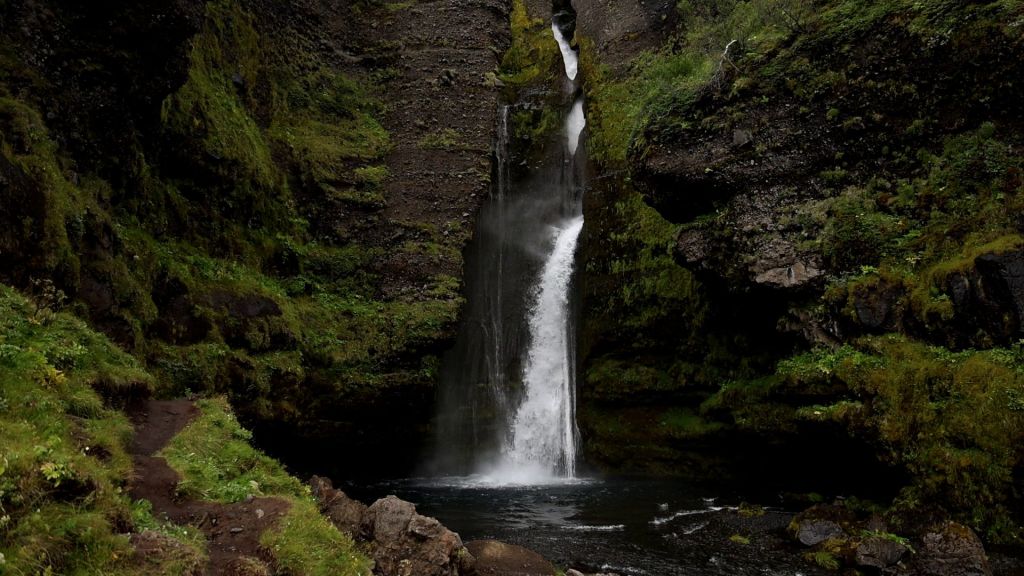 Der Wind wehte hier wieder mal aus allen Richtungen. Auch wenn das Wetter insgesamt freundlich war, ist die Kombination aus sprühendem Wasserfall und Wind etwas, was auf kurz oder lang die Kälte in einen treibt. Als hartgesottene Islandfans sind wir darauf aber natürlich bestmöglich vorbereitet. In der Folge sah es dann so aus, dass immer mehr Leute vom Wasserfall fröstelnd weggingen, während wir eisern dastanden und das Schauspiel genossen.
