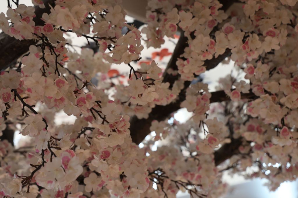 Das Buffet war dann wieder recht schön und lecker und weil das so ist, verdient es sich heute nun auch keiner tieferen Erwähnung. Stattdessen hat es mich viel mehr gefreut, dass ich mit der neuen Kamera scheinbar auch langsam ein Gefühl dafür kriege, Details in meiner Umgebung zu sehen. Zwar scheitert es hier und dort noch an Belichtungen, Fokus oder sonstigen Einstellungen – aber ich halte schon mal gezielter die Linse auf die Objekte meiner visuellen Begierde. Im heutigen Fall war das eine Kirschblüten-Imitation im japanischen Restaurant.