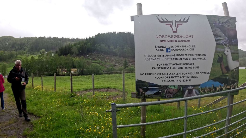 Unser Bus war nicht mal zur Hälfte gefüllt. Gemessen an zig Tausenden Menschen an Bord und noch mehr im Fjord haben wir uns zwar etwas über diesen Zustand gewundert, ihn aber natürlich dankend angenommen. Die Tour bekam dadurch direkt einen sehr familiären Touch. Alle waren gut drauf und nach gut einer halben Stunde Fahrt, standen wir dann auch schon in der Einfahrt der Hirschfarm.