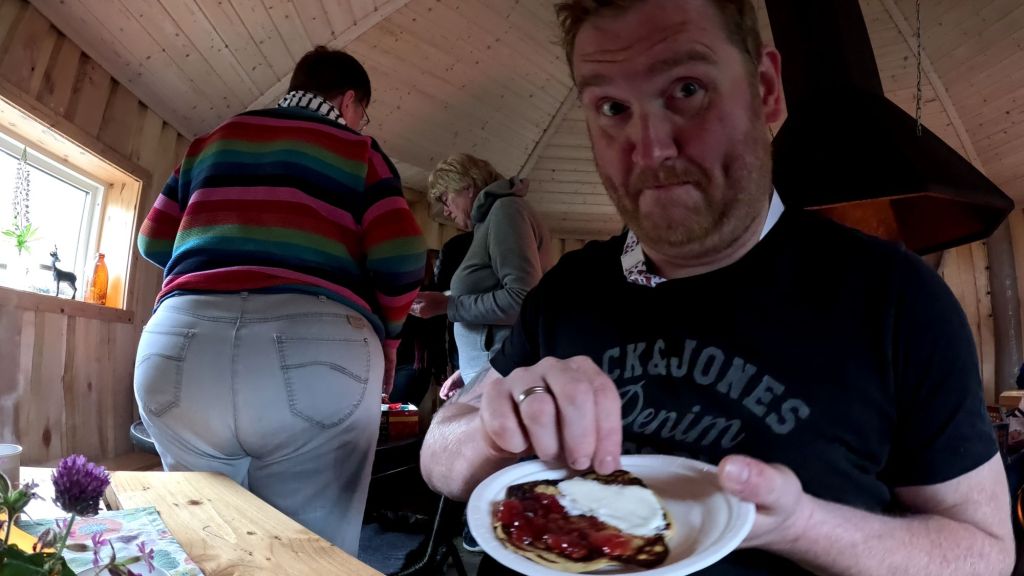 Als dann alle im kleinen Haus waren und auf Bänken saßen, bekamen wir selbstgemachte Pfannkuchen auf norwegische Art. Das meint, dass man sie halb mit Sour-Creme beschmiert und die andere Hälfte mit Marmelade. Dann wird das ganze zusammengeklappt. Bon Appetit