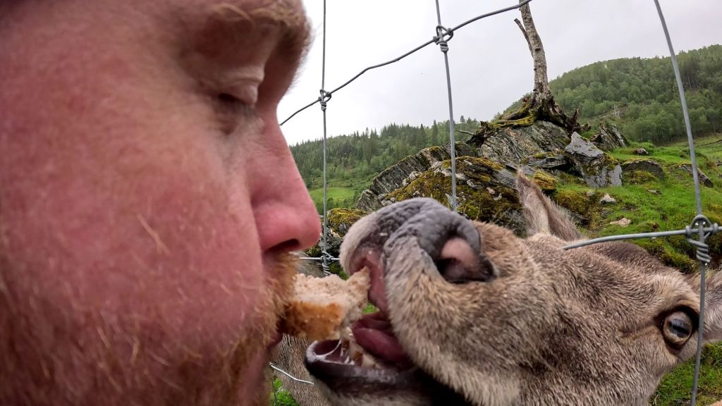 Vor einem Tor drückte man dann jedem von uns einen Ast mit Blättern in die Hand und signalisierte uns, dass wir mal einen kurzen Moment warten sollten. Und so standen wir dann da: Platzregen, ein Ast in der Hand, auf einer Wiese in Norwegen… was man halt so macht. Über einen Hügel kamen dann tatsächlich Lamas angelaufen. So wie wir sie sahen, sahen sie glaub ich nur das Futter und stürmten recht zielstrebig auf uns zu. Ich hätte heute Früh auch nicht gedacht, dass ich heute noch ein Lama füttere – aber hier stand ich nun.