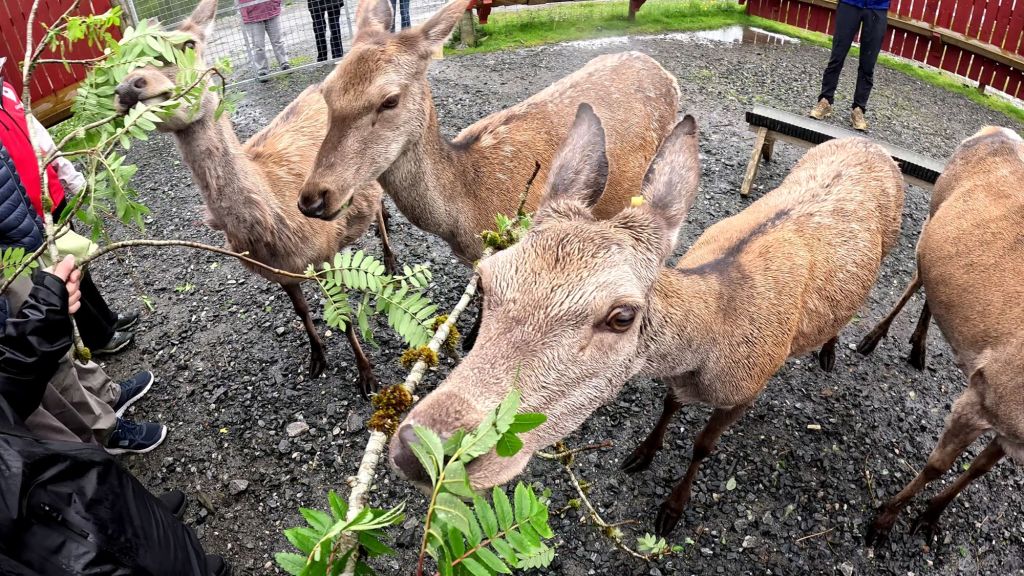 Wir wurden dann wieder mit einem Ast voller Blätter bewaffnet und in einer Reihe in ein Gehege aufgestellt. Am Zaun wurden die Hirsche gerufen. Dann wurde das Tor geöffnet und erneut wäre ich nicht sicher, ob die Tiere überhaupt registriert haben, dass sie gerade nicht von einem Strauch fressen, sondern von einem Menschen gefüttert werden.
