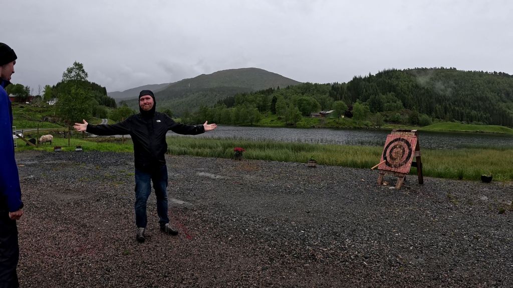 Meine liebe Frau Gattin hat übrigens auch die Axt geworfen und dabei offenbar ihr Showtalent gefunden. Der erste Wurf ging noch direkt in den Boden. Der zweite Wurf landete irgendwo im Schilf, woraufhin der Gastgeber meinte, sie hätte einen Frosch getötet. Doch dann, als der dritte Wurf anstand, hielt sie kurz inne und forderte die kleine Gruppe auf, sie anzufeuern. Als eingeschworener Kreis von Touristen taten wir natürlich, was man uns befahl. Dann holte sie aus, legte die geballte Kraft einer Urlauberin in den Wurf und… Volltreffer! Die Menge jubelte und noch vor Ort wurde sie von den hiesigen Norwegern für das olympische Axtwurfteam auserkoren. Wenn das mal keine Erfolgsgeschichte ist.