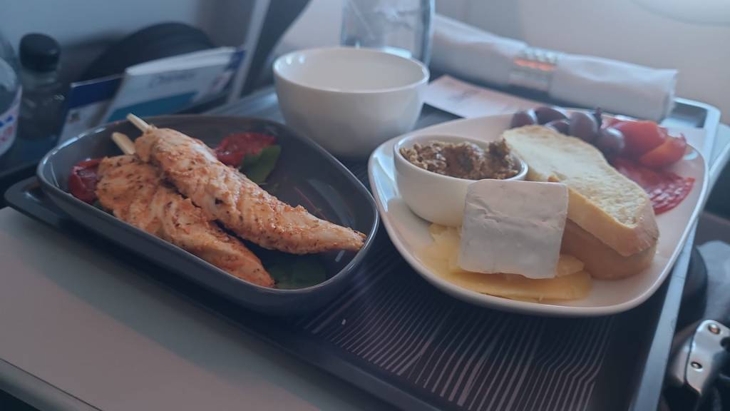 Es gibt in der Premiumklasse dann auch ungefragt was zu Essen. Irgendwie Tapas Hähnchen… Schinken… Tomaten und isländischen Käse. Das kann man auf jeden Fall mal so machen.