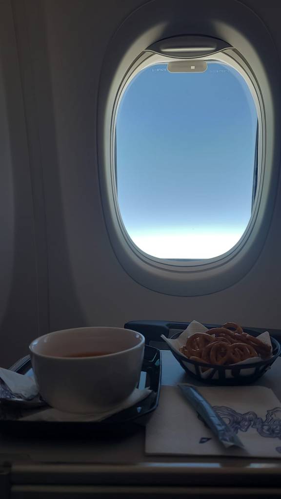 Man darf dann auch als einer der ersten ins Flugzeug. Das ist im Grunde relativ egal. Aber man hat dann auch gesichert keinen Stress mit seinem Handgepäck. Im Flieger selbst sitzt man dann nicht in einer Dreier-Reihe, sondern hat die komfortablen 2er Reihen. Es gibt dann auch nicht nur so lieblos Wasser aus einem Plastikbecher. Da kommt dann schon jemand und hat das gute Porzellan und fancy Schälchen für die Brezeln.