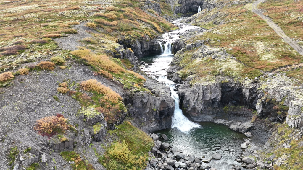 Tatsächlich war es für uns auch das erste mal, dass wir ihn bemerkt haben. Und das, obwohl wir mindestens schon zwei mal zuvor an ihm vorbei gefahren sein müssten. Warum auch immer wir ihn nun heute fanden, es lohnte sich auf jeden Fall für den kleinen Stopp. Ich konnte auch noch mal meine Drohne auspacken und beiläufig erinnerte uns Island so auch noch mal daran, dass es neben Walen auch noch andere schöne Dinge gibt.