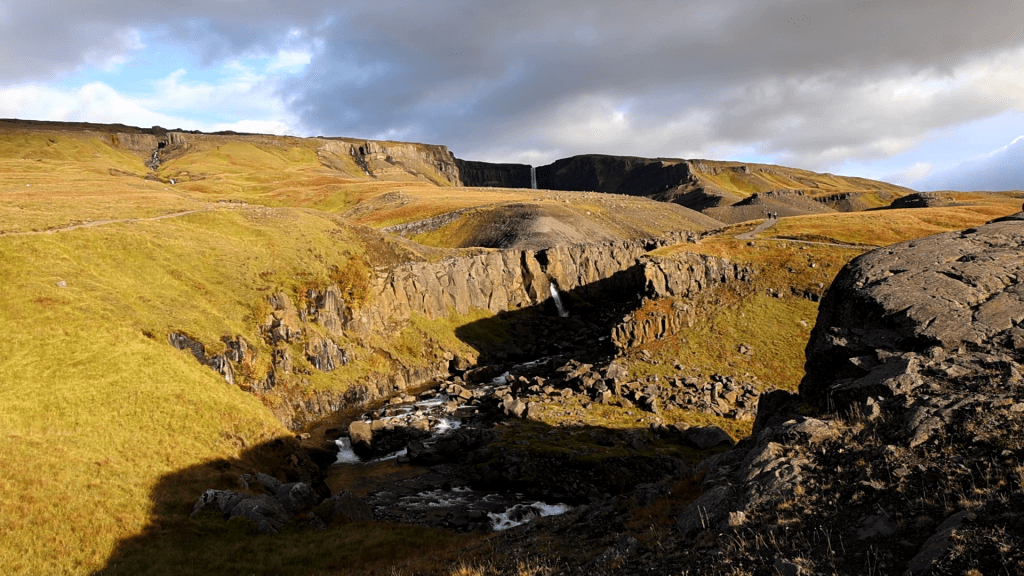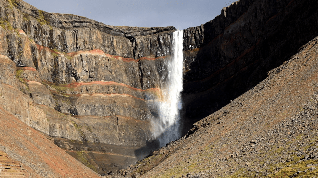Das Wechselspiel zwischen Sonne und Wolken sorgte dann noch dafür, dass der Hengifoss im Minutentakt in anderem Licht zu sehen war. Manchmal gab es einen Regenbogen dazu, manchmal wehte eine Windböe einen weiten Schleier aus dem Wasserfall. Man kann hier schon eine Weile sitzen und staunen. Das tat ich auch und war wieder einmal sehr glücklich mit der Welt und mir.