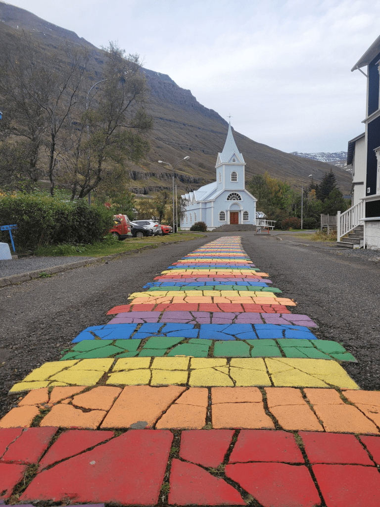 Auf dem Weg zum Auto hatten wir dann kurz mal die gesamte Regenbogenstraße des Ortes für uns allein. Am Ende steht eine Kirche und wieder einmal tut sich der Verdacht auf, dass Island eigentlich nur gemacht wurde, damit Influencer coole Motive haben. Aber ich gebe zu, ich fand das auch sehr schick.
