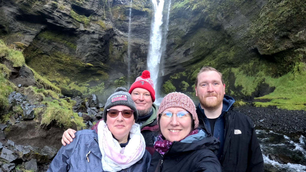 Und so standen wir da. Die Islandprofis und unsere Freunde als Island-Novizen. Da es hier möglich war, gingen wir dann auch zusammen hinter den Wasserfall. Leider steht man da morgens so, dass man gegen das Licht fotografiert. Für den Blog habe ich mich daher mal entschieden, ein Bild zu nehmen, bei dem wir auch zu sehen sind. Kleiner Vorteil von der Idee ist auch, dass wir hinterm Wasserfall doch deutlich nasser wurden und so auf dem Bild eben auch etwas trockener aussehen.