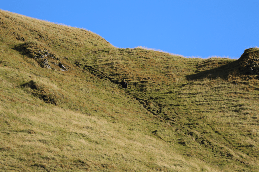 Worum ging es nun eigentlich? Wir waren beim Stóra-Dimon. Es handelt sich dabei um einen Berg. Aber nicht irgendeinen Berg. Es ist ein einzelner Berg, mitten in einem Niemandsland. Einst verlor ich hier fast meine Drohne, aber der eigentlich Grund für unseren heutigen Besuch war, dass ich letztes Jahr versucht auf die Spitze des 178m hohen Berges zu kommen und leider scheiterte. Der Weg war matschig und ich konditionell nach etwa 75% des Weges derart fertig, dass ich kaum wusste, wie ich jemals wieder heil runter kommen sollte. Aus irgendeinem Grund nagte das seitdem an meinem Ego und nun stand ich heute wieder vor dem Berg und musste da einfach für mich nach oben.