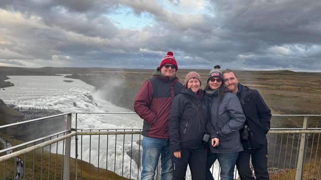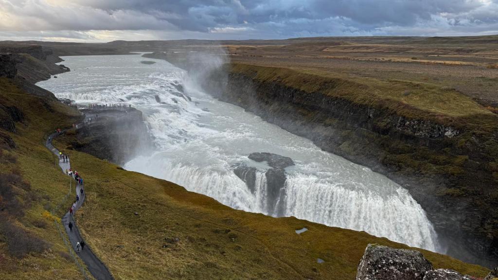Wir fuhren zu unserem letzten Punkt auf unserer heutigen Liste. Wir fuhren nur knapp 10 Minuten und schon waren wir am „Godfather of Waterfalls“: Der Gullfoss. Zumindest von denen, die ich kenne. Der Parkplatz war voll mit Menschen, aber das hielt uns nicht ab uns auch in die Zombieparade der Touris einzureihen. Wir liefen also in Richtung Wasserfall los und sahen immer wieder die gleichen Leute. Diese jenigen welche wir auch schon am Diamond Beach und am Strokkur gesehen haben. Ist Island nicht ein Dorf?